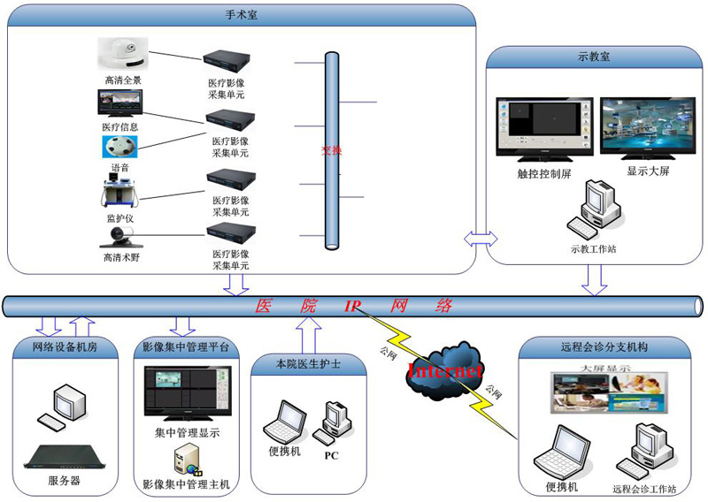 達(dá)實(shí)久信手術(shù)示教會(huì)診系統(tǒng)是結(jié)合現(xiàn)代智能建筑技術(shù)、計(jì)算機(jī)技術(shù)、網(wǎng)絡(luò)技術(shù)、通信技術(shù)、音視頻編碼傳輸、跨平臺(tái)通信網(wǎng)絡(luò)設(shè)計(jì)與施工的綜合性平臺(tái),可為醫(yī)院提供一個(gè)完整的手術(shù)教學(xué)及遠(yuǎn)程會(huì)診的解決方案。